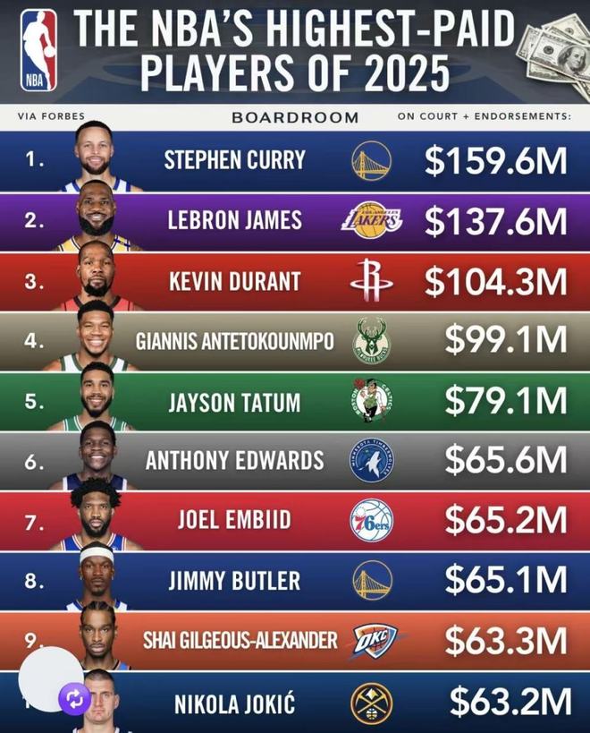 2025年NBA球员收入榜前10榜单发布:库里11.20亿元 詹姆斯9.66亿