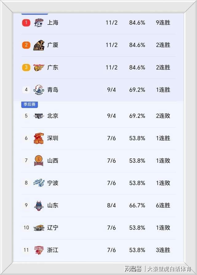 CBA排名又乱了!上海九连胜独占鳌头,北京跌第五,山东逼近前四