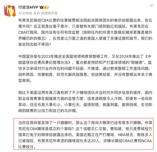 此次事件是美国媒体报道,美国这两年真刀真枪抓了不少赌球团伙并及时对外同步信息,此次抓到布莱克尼团队属于顺带披露,还不是专门侦察,作为对比,国内CBA公司并没有率先发现赌球、打假球的情况。