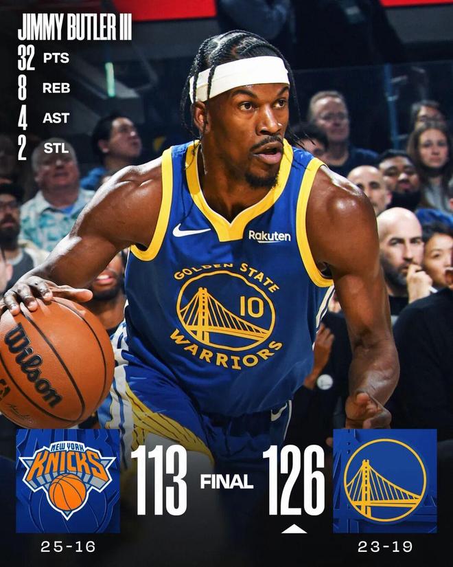 2026年01月16日 勇士20记三分射穿尼克斯!库里27+7 巴特勒32+8 穆迪三分9中7