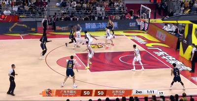 上半场广东凭借胡明轩节末阶段的关键3+1,艰难取得56-55领先。