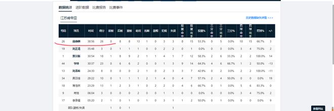 庞峥麟全场出战38分56秒,投篮15中8,罚篮15中10,砍下26分8篮板13助攻1抢断的两双数据。