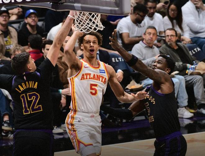 沃克虽然砍下26分4篮板3助攻,麦科勒姆贡献25分3助攻,但两人合力也难以扭转大局。老鹰的进攻在湖人严密的防守体系面前显得异常挣扎。其实湖人从比赛一开始就掌控了节奏。首节詹姆斯与东契奇双核同时发力,球队迅速建立7分领先优势。进入第二节,东契奇突然进入“杀神模式”,他连突带投一人主导了一波21-4的恐怖攻势,帮助湖人将分差瞬间拉开到21分。上半场结束时,湖人以81-60领先21分,这也是他们本赛季单节得分新高,充分展现了火力全开的恐怖状态。