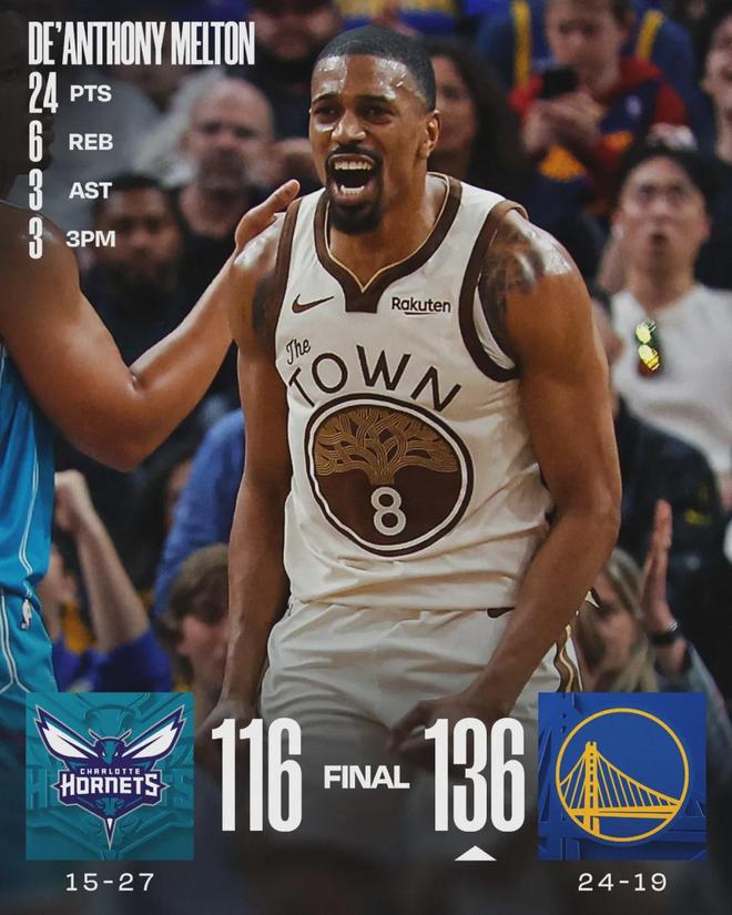 北京时间1月18日, NBA常规赛,勇士136-116大胜黄蜂。勇士后卫梅尔顿替补出战21分27秒,投篮16中8,三分6中3,罚球5中5,得到24分6篮板3助攻1抢断1失误2犯规,正负值+24。得分勇士全队最高,正负值并列全场最高。