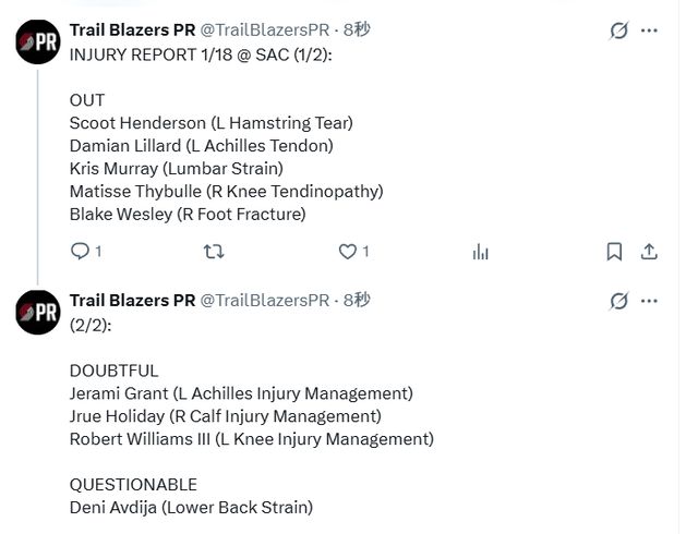 大概率缺阵的包括:格兰特(左跟腱伤病管理)、霍勒迪(右小腿伤病管理)、罗伯特-威廉姆斯(右膝伤病管理)