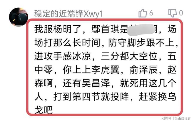 赛后,许多辽宁球迷也纷纷吐槽“手帝”。“我服杨呜了,鄢手琪场场打那么长时间,防守脚步跟不上,进攻手感冰凉,你上上李虎翼,俞泽宸啊,还有吴昌泽,就死用这几个人,打到第四节就投降,赶紧换乌戈吧”;“把鄢手骐焊场上了,一副无所谓的样子看着就烦,有他在,辽宁不带好的”;“输了,我们认,但是,杨导,如果让手帝这么浪投下去,不如让代彦龙,他们这些孩子上来打打。”。