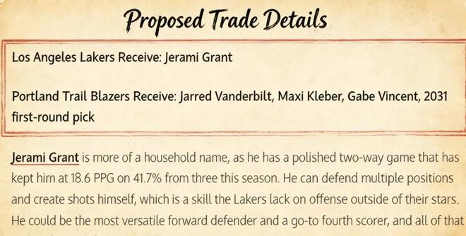 美媒《Fadeaway World》撰文建议,湖人可以考虑将范德比尔特、克莱伯、文森特以及2031年的首轮签送到波特兰,换回前锋格兰特。