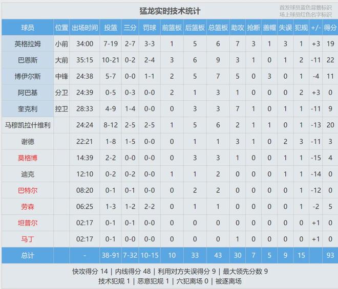英格拉姆手感冰凉,第一节6中1仅得3分。湖人的问题是失误太多,单节出现6次失误。首节战罢,猛龙30-23领先湖人7分。第二节一开始,詹姆斯带着湖人替补完成反超。奎克利太惨了,首节被东契奇点名单打,次节被詹姆斯点名。