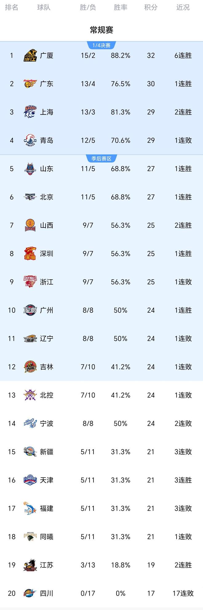CBA一夜三场惨案!广厦广东皆大胜,北控输29分,最新积分榜如下