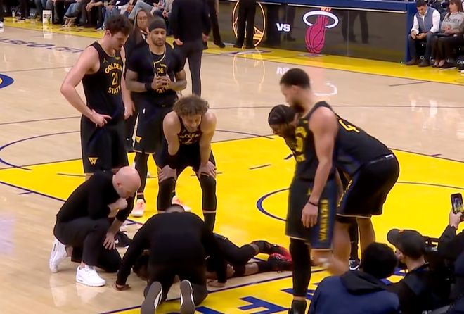 第三节还剩下7分多钟的时候,巴特勒和小米切尔争抢球权时倒地,随后巴特勒痛苦地捂着自己的膝盖,之后勇士立刻叫暂停,队医、队友和主帅科尔都上前查看其伤势。巴特勒在地板上躺了很久,才在队友的搀扶下,返回更衣室接受进一步治疗。他的右脚无法承重,离场前,顽强的巴特勒挤出了令人心酸的笑容。