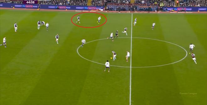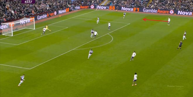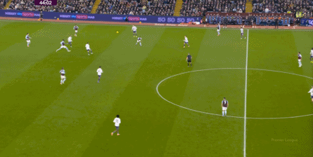 这里都是没问题的,但到了前场,芒特在背身的情况下被奥纳纳顶掉,球权转换,阿斯顿维拉开始向前: