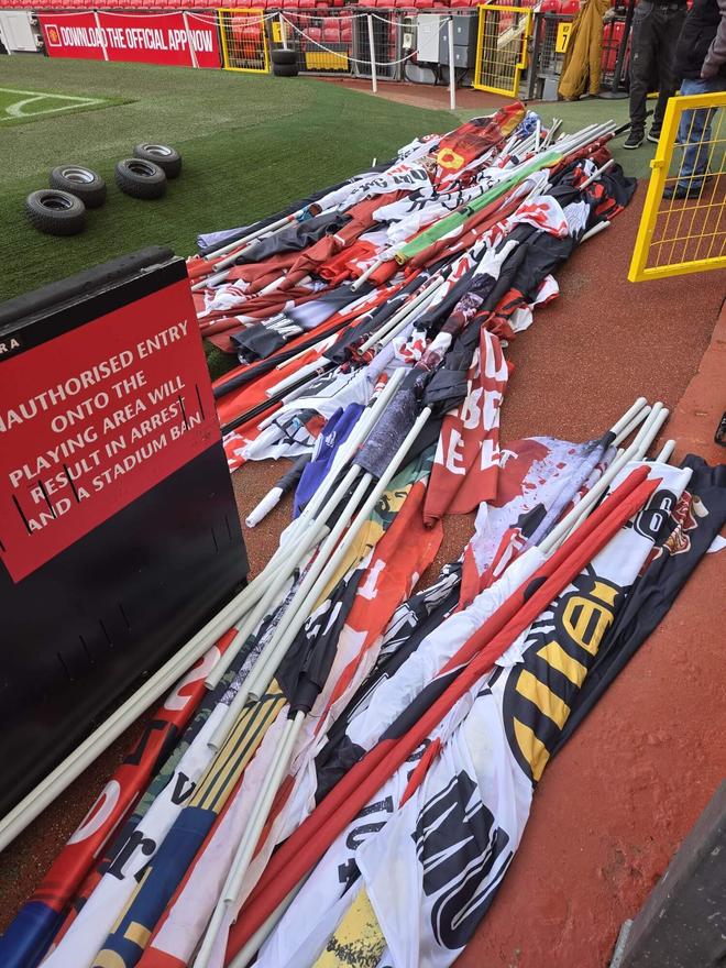 在12月4日对阵西汉姆联的1-1平局比赛前,The Athletic与“红色军团”的成员们进行了会面。他们在那场周四比赛的前一晚聚集,十几个人花了几小时将旗帜布置在斯特雷特福德看台周围。这些旗帜通常在比赛间隙储存在球场内,该组织的几名成员最近还被邀请到训练基地与曼联球员会面。