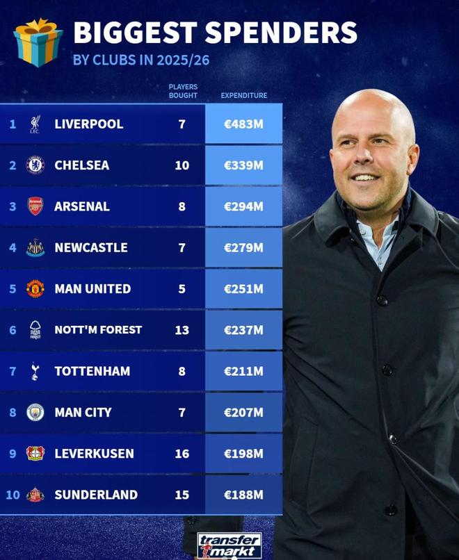 北京时间12月25日,在圣诞节之际,德转列出了世界足坛本赛季引援支出榜,利物浦以超4.8亿欧元高居第一,切尔西约3.4亿欧元第二,阿森纳约2.9亿欧元第三。