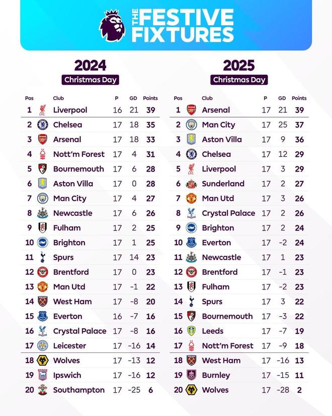 北京时间12月25日,德转列出了2024年和2025年圣诞节当天的英超积分榜,巧合的是,利物浦和阿森纳以相同的积分以及净胜球分别排名第一。与上赛季同期相比,阿森纳(+6分)、曼城(+10分)、阿斯顿维拉(+8分)以及曼联(+4分)成绩均有提升。