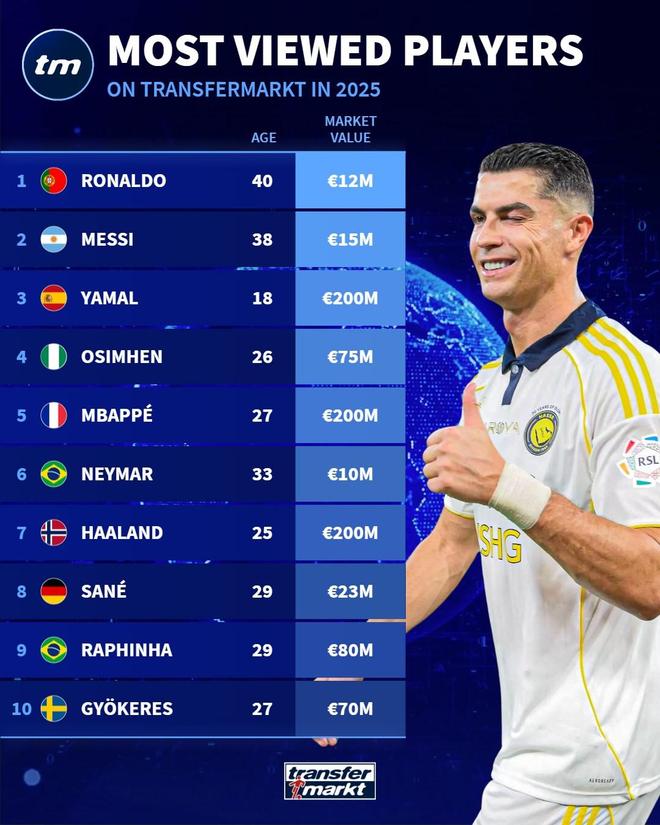 德转2025年度球员浏览量排名:C罗第1,梅西第2,亚马尔第3