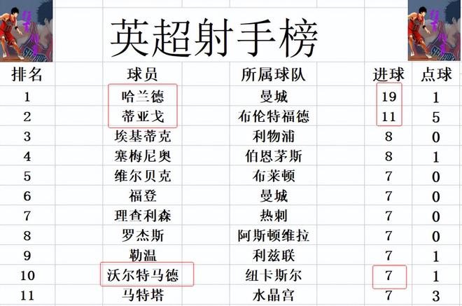 射手榜方面,哈兰德19球高居榜首,蒂亚戈11球位列第2,埃基蒂克和塞梅尼奥8球并列第3。沃尔特马德今天无力破门,还是和福登,理查利森等人7球刚好挤入前十。