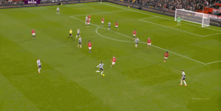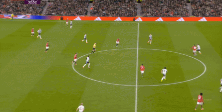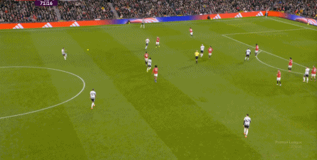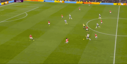 这个位置,其实指的就是阿玛德目前的队内位置,三后卫体系当中的右翼卫,但在实际上,阿玛德的无球位置也并不像翼卫,他经常因为压迫和进攻职责出现在左中卫身前,只是需要跟人和防守的时候才会回到禁区内和边线处: