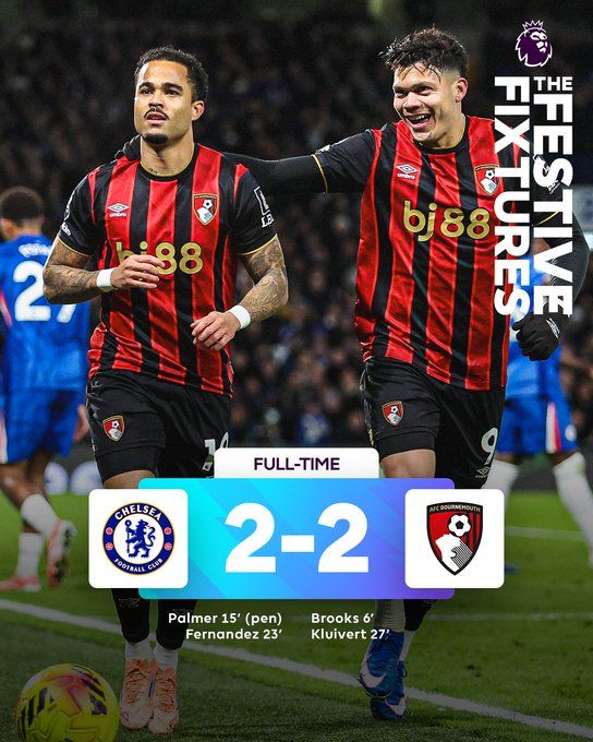 2025年12月31日 切尔西2-2伯恩茅斯7轮仅1胜 伯恩茅斯10轮不胜帕尔默点射恩佐破门