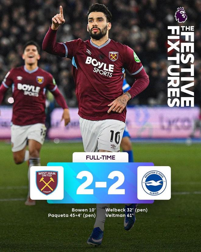 2025年12月31日 八轮不胜!西汉姆2-2布莱顿仍处降级区 鲍文闪击帕奎塔送点+点射