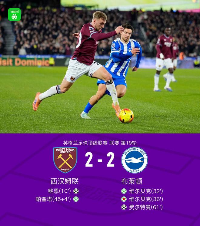 北京时间12月31日,英格兰足球超级联赛第19轮展开角逐,西汉姆联坐镇主场迎战布莱顿。比赛伊始,帕奎塔助攻鲍恩率先破门,维尔贝克通过点球为布莱顿扳平比分。不久之后,维尔贝克再次主罚点球,但未能命中。上半场补时阶段,帕奎塔点射帮助西汉姆联再度领先。进入下半场,费尔特曼抓住机会打入一球,为布莱顿扳平比分。最终,双方以2比2握手言和。