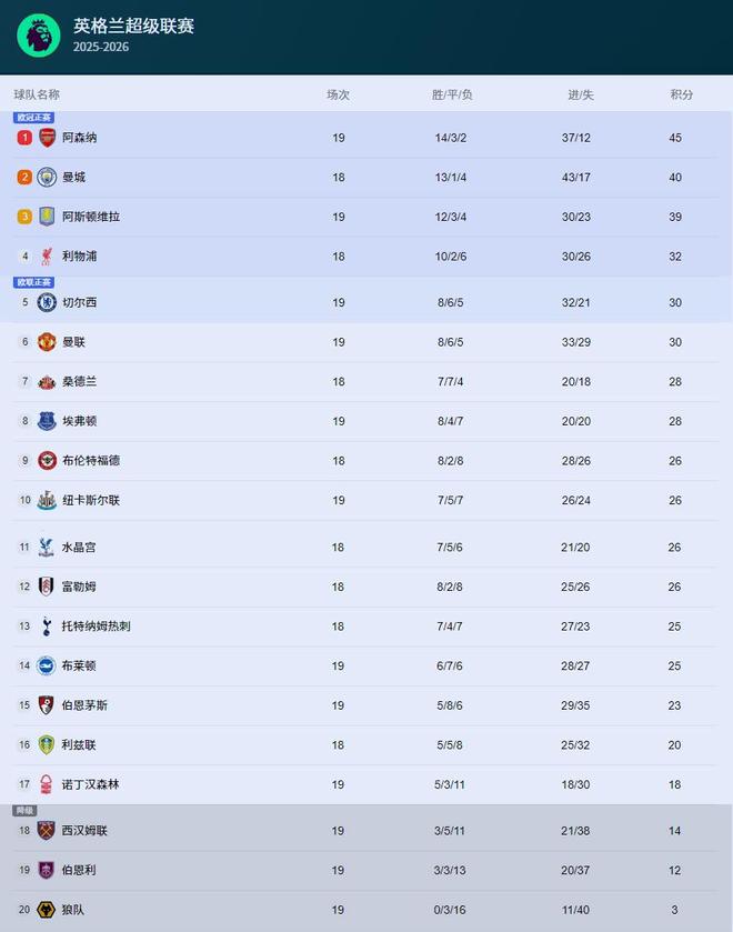 英超2025年积分榜:阿森纳83分居首,曼城第二利物浦第四