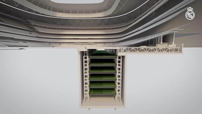 球场被分成六个部分,每部分宽11.67米,长107米。当需要更换时,一个惊人的工程技术使它们可以整齐地折叠到地下深处。这使得皇马能够快速高效地更换比赛场地,或换成其他用途的场地。