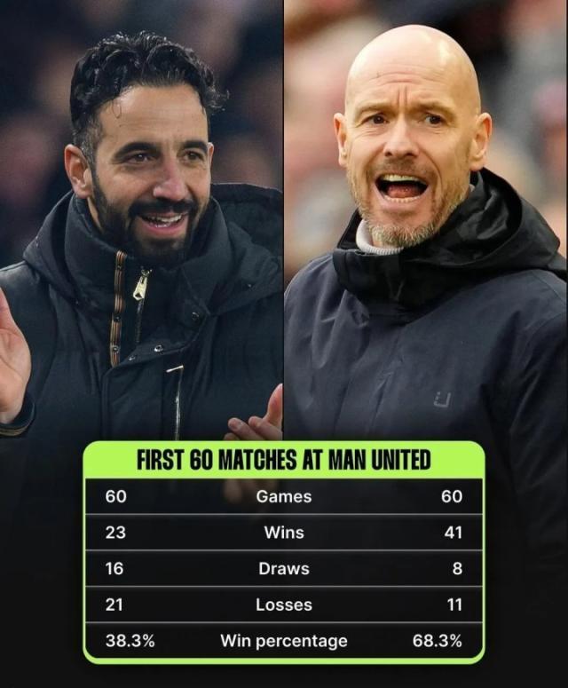 阿莫林执教曼联前60场23胜胜率38.3%,滕哈赫胜率68.3%