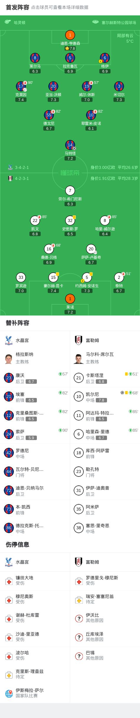 水晶宫1-1富勒姆,马特塔破门,凯尔尼建功