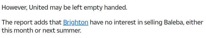 布莱顿认为,曼联之所以接二连三地探寻巴莱巴的转会,属于居心叵测,想要因此动摇球员的专注度,影响他的发挥,从而起到压低价格的效果。红魔希望以低于8000万英镑的价格,从「海鸥军团」得到巴莱巴。