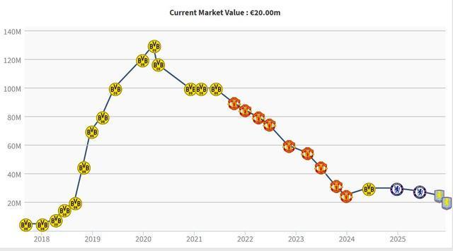 而根据德国转会市场网站的历史数据,桑乔在2020年效力多特蒙德时身价曾高达1.3亿欧元,而目前他的身价已跌至2000万欧元。