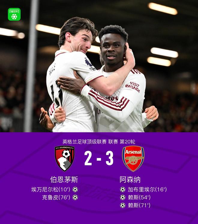 2026年01月04日 联赛五连胜!阿森纳3-2逆转伯恩茅斯先赛6分领跑 赖斯双响
