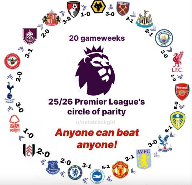 2025-26赛季英超各队交战完美闭环: