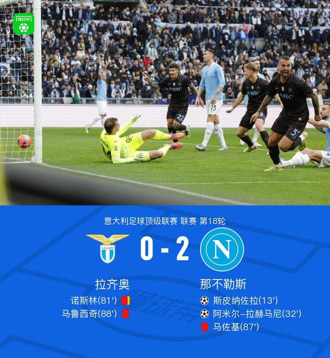 北京时间1月4日意大利足球顶级联赛 联赛 第18轮,拉齐奥主场对阵那不勒斯。那不勒斯斯皮纳佐拉破门,阿米尔-拉赫马尼破门。最终比分拉齐奥 0-2 那不勒斯。