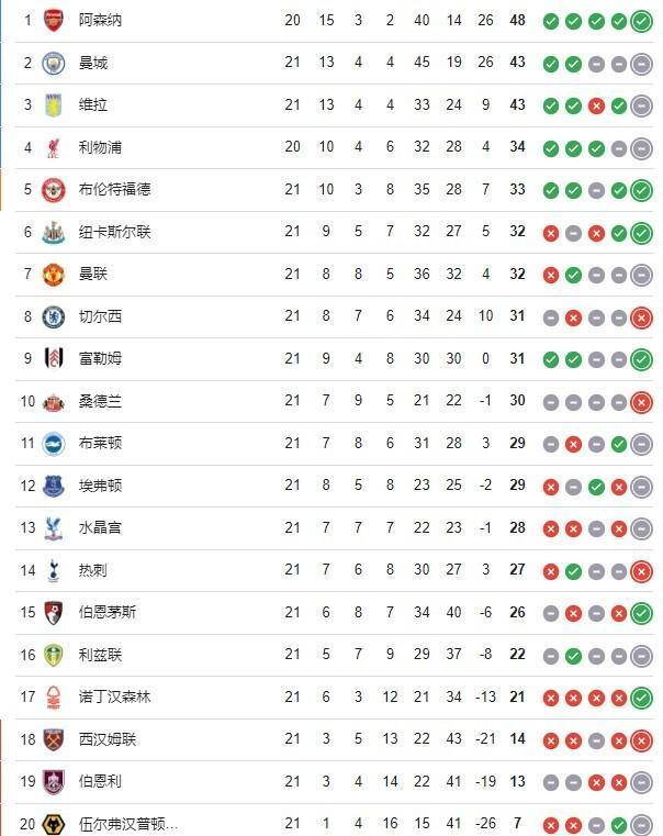 积分榜方面,曼城3连平之后积43分,先赛落后榜首阿森纳队5分。阿斯顿维拉本轮战平后同积43分,暂列积分榜第3位。布伦特福德本轮取胜后升至积分榜第5位,曼联、切尔西分别排在第6和第7位。