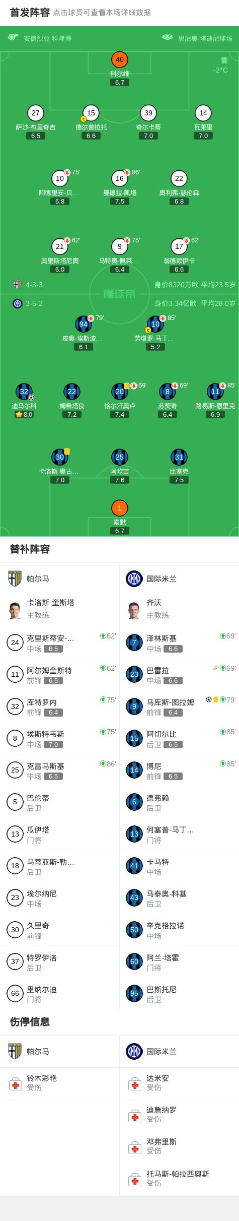 帕尔马vs国际米兰:马特奥-佩莱格里诺、阿德里安-贝尔纳韦首发,劳塔罗-马丁内斯、恰尔汗奥卢出战