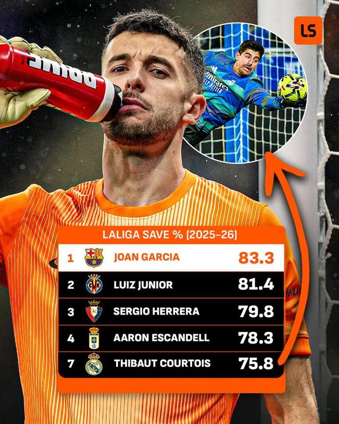 巴萨门将霍安-加西亚目前以83.3%的扑救成功率位居首位,紧随其后的是比利亚雷亚尔的路易斯-儒尼奥尔,成功率为81.4%,两人也是目前唯二扑救成功率超过80%的门将。