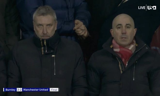 换帅的曼联开局不利,第13分钟,伯恩利左路直塞,巴希尔·汉弗莱斯果断传中,海文伸脚拦截,不料皮球击中他的右脚后边线直接坠入网窝,曼联0-1落后伯恩利。这已经是海文连续两场需要为丢球负责了,场边的弗莱彻一动不动,镜头直接对准了看台上的曼联首席执行官奥马尔·贝拉达和体育总监贾森·威尔考克斯,他们把脸埋进领子中。