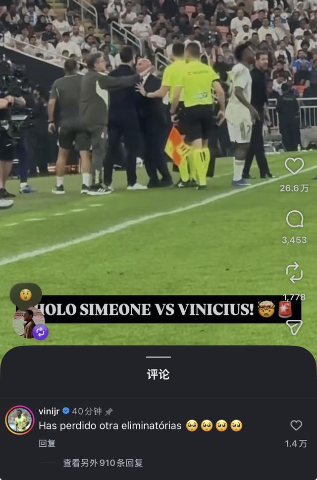 罗马诺在社交媒体发布了维尼修斯和西蒙尼发生冲突的视频,维尼修斯在下方评论表示:“(他)又输掉了一场淘汰赛。”