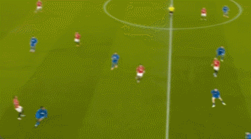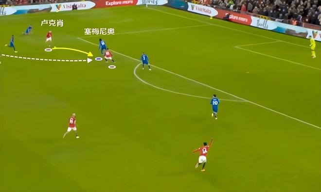 这一次的退防可以从曼联的后场30米区域看起,当时塞梅尼奥处于无球状态,他意识到曼联的左边中卫卢克肖将会前插,于是塞梅尼奥非常警觉地一路高速回追。