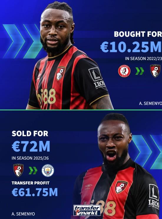 昨天,塞门约官宣加盟曼城。德转今天也列出了伯恩茅斯近年来几笔低买高卖的交易。