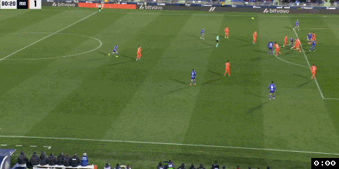 第89分钟,赫塔菲获得获得中线处任意球机会,米拉操刀主罚大力往禁区里吊过去,阿兰巴里禁区弧顶处扛住防守头球摆渡一蹭,胡安米小禁区抢点凌空扫射得手,赫塔菲1:1扳平比分。赫塔菲球员在开心的庆祝“绝平”,然而补时6分钟最后30分钟,他们却遭到重击,皇家社会右侧角球机会,久保建英操刀主罚兜传后点,门将索里亚出击失误没有击打到球,阿兰布鲁后点抢点甩头攻门,皮球击地后弹入网窝,皇家社会2:1压哨绝杀赫塔菲。