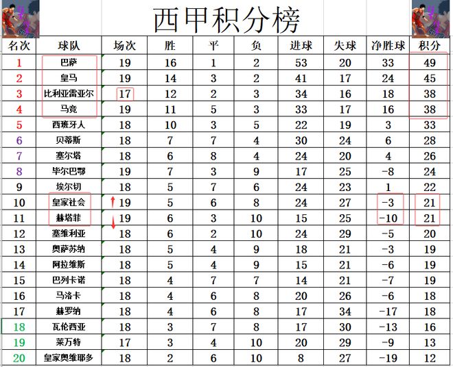 积分榜方面,巴萨4分优势力压皇马领跑,比利亚雷亚尔少赛2轮落后皇马7分,本轮他们有机会赢球缩小和皇马的差距,若补赛也能赢,他们最理想的可以将差距缩小到1分,紧追皇马坐稳第3。皇家社会绝杀赫塔菲后,凭借着净胜球优势超过赫塔菲,暂时挤入上半区。