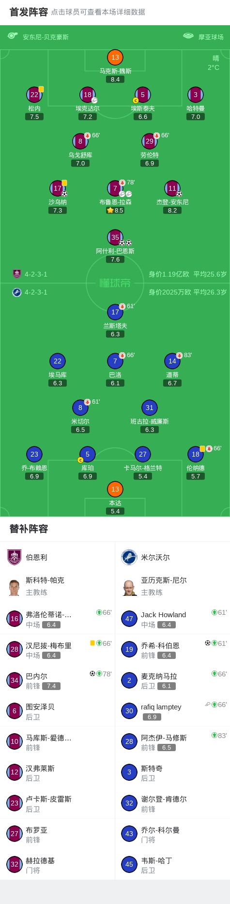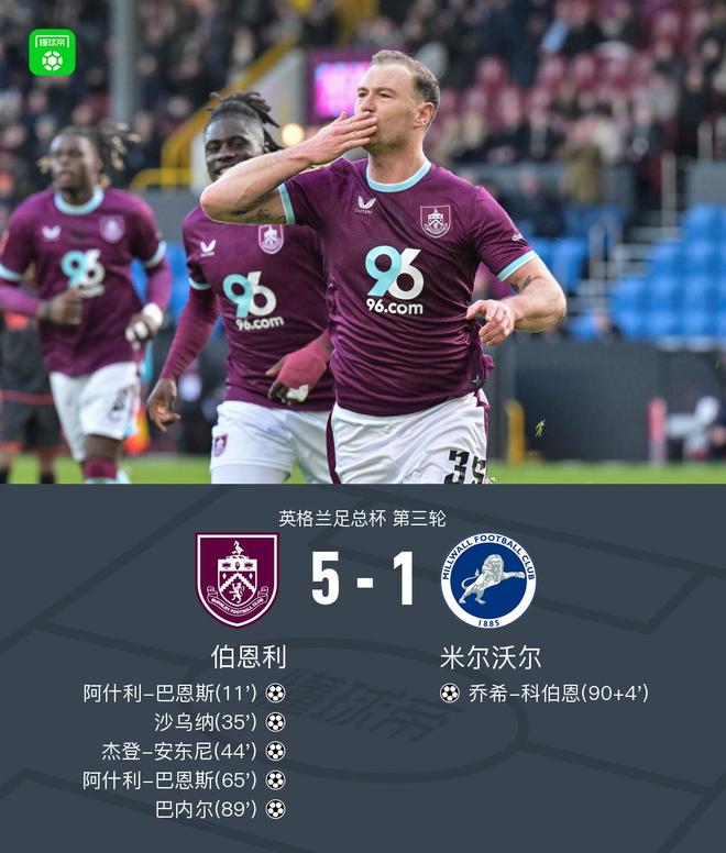 第89分钟,巴内尔推射补射破门,伯恩利5-0米尔沃尔
