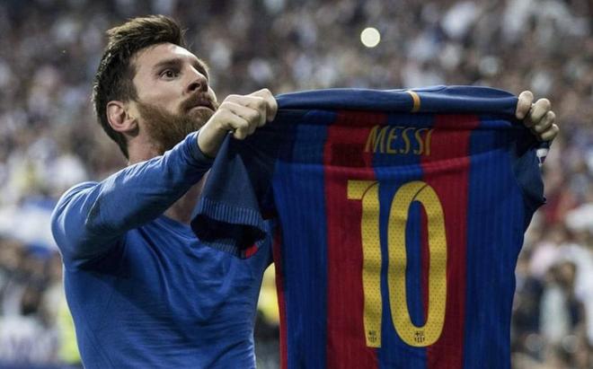 值得一提的是,护腿板上的这张照片,正是梅西在国家德比中、于伯纳乌对阵皇马时晒球衣的经典照片。