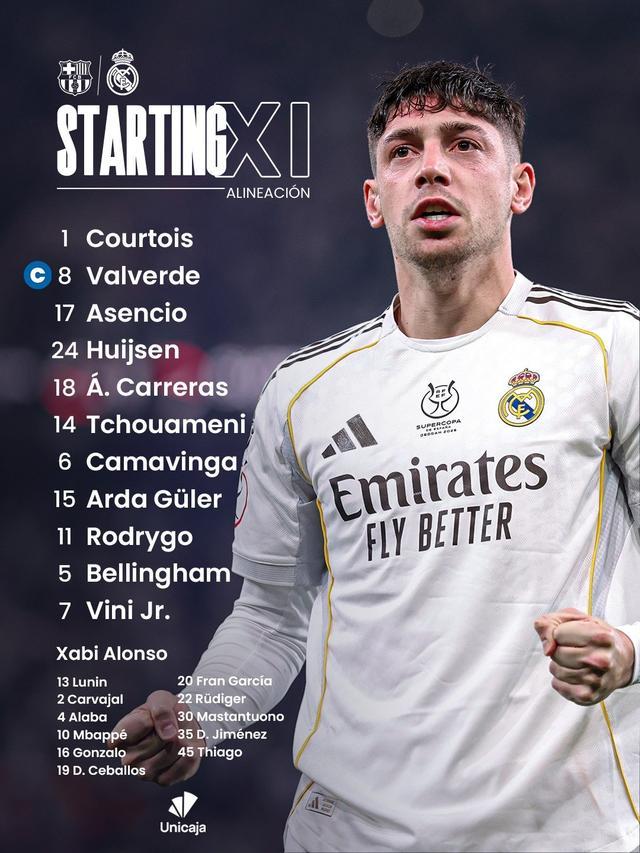 皇家马德里首发:1-库尔图瓦、18-阿尔瓦罗-卡雷拉斯、17-劳尔-阿森西奥、24-赫伊森、8-巴尔韦德、14-楚阿梅尼、6-卡马文加、15-居莱尔、11-罗德里戈、5-贝林厄姆、7-维尼修斯