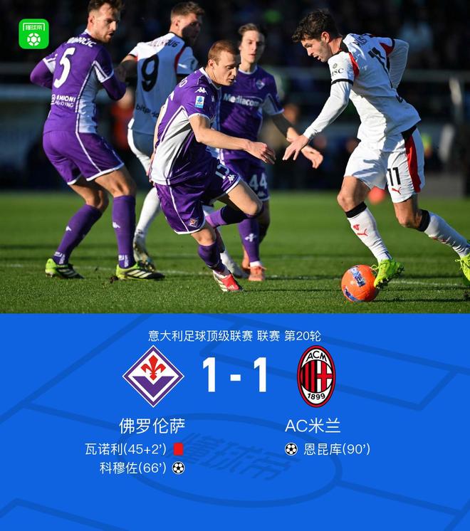北京时间1月11日意大利足球顶级联赛 联赛 第20轮,佛罗伦萨主场对阵AC米兰。上半场佛罗伦萨主帅瓦诺利抗议判罚,裁判连出两张黄牌将其罚出场。下半场古德蒙德松开出角球,科穆佐头球破门,比赛尾声福法纳送助攻,恩昆库爆射破门。最终米兰客场1-1战平佛罗伦萨。