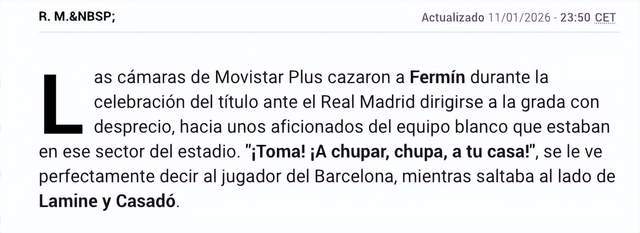 而在本场比赛结束后,西班牙媒体《马卡报》在报道中指出,巴萨部分球员有侮辱皇马球迷的行为,该媒体表示,巴萨球员费尔明在赛后边跳边对着皇马球迷看台喊话,大致的意思是“回家吃奶去吧!”。此外,还有媒体捕捉到,赛后巴萨球员库巴西对着皇马球迷看台做出了剪刀手的手势,而这个手势在西班牙则类似于国内竖中指的手势。