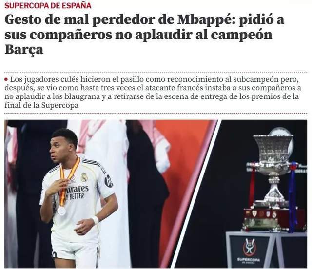 更有意思是的,在比赛结束后的颁奖典礼中,皇马球员姆巴佩要求队友们不要为巴萨鼓掌,虽然在赛后巴萨球员为皇马球员进行了列队,但姆巴佩被拍到三次督促队友不要为巴萨鼓掌,并示意大家尽快离开决赛颁奖典礼现场,而姆巴佩的这一举动也被不少球迷和媒体批评太小气!