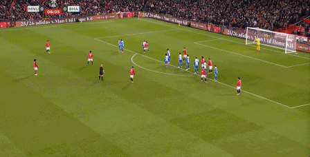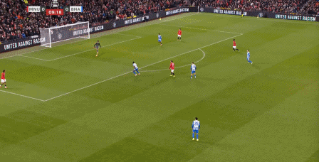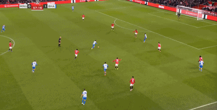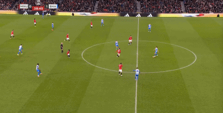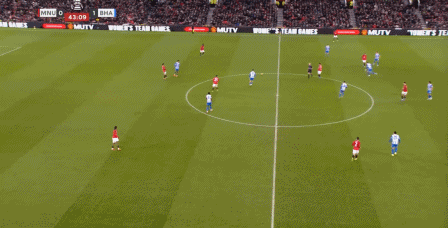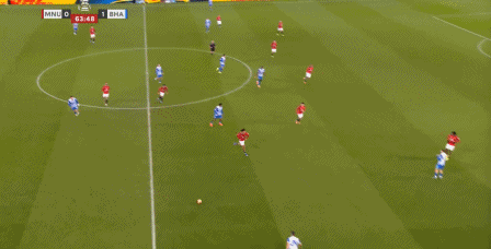 这次进攻没打成,被布莱顿倒到另一侧之后,曼联中场极度空虚,乌加特缩进后卫线,而约罗更没有弹出来的想法,所以当你觉得库尼亚是不是在和谢什科打双前锋的时候,他又在这次防守里回到了左边路: