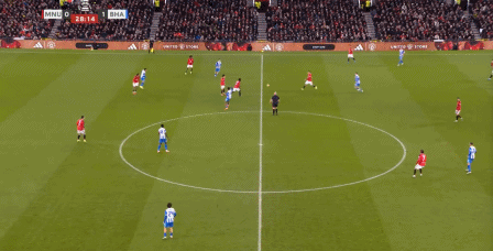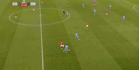 你还别不相信,因为在第31分钟这次防守,布莱顿又用转移打到了曼联的左路,你看是谁在和芒特一起防守?